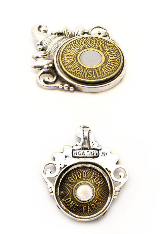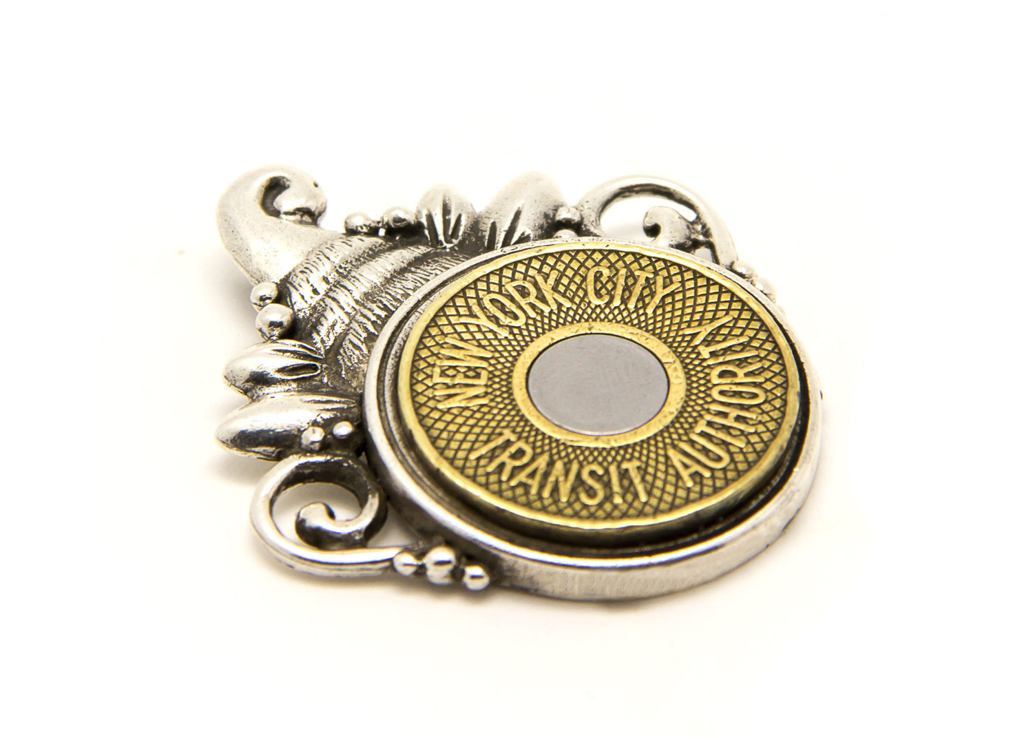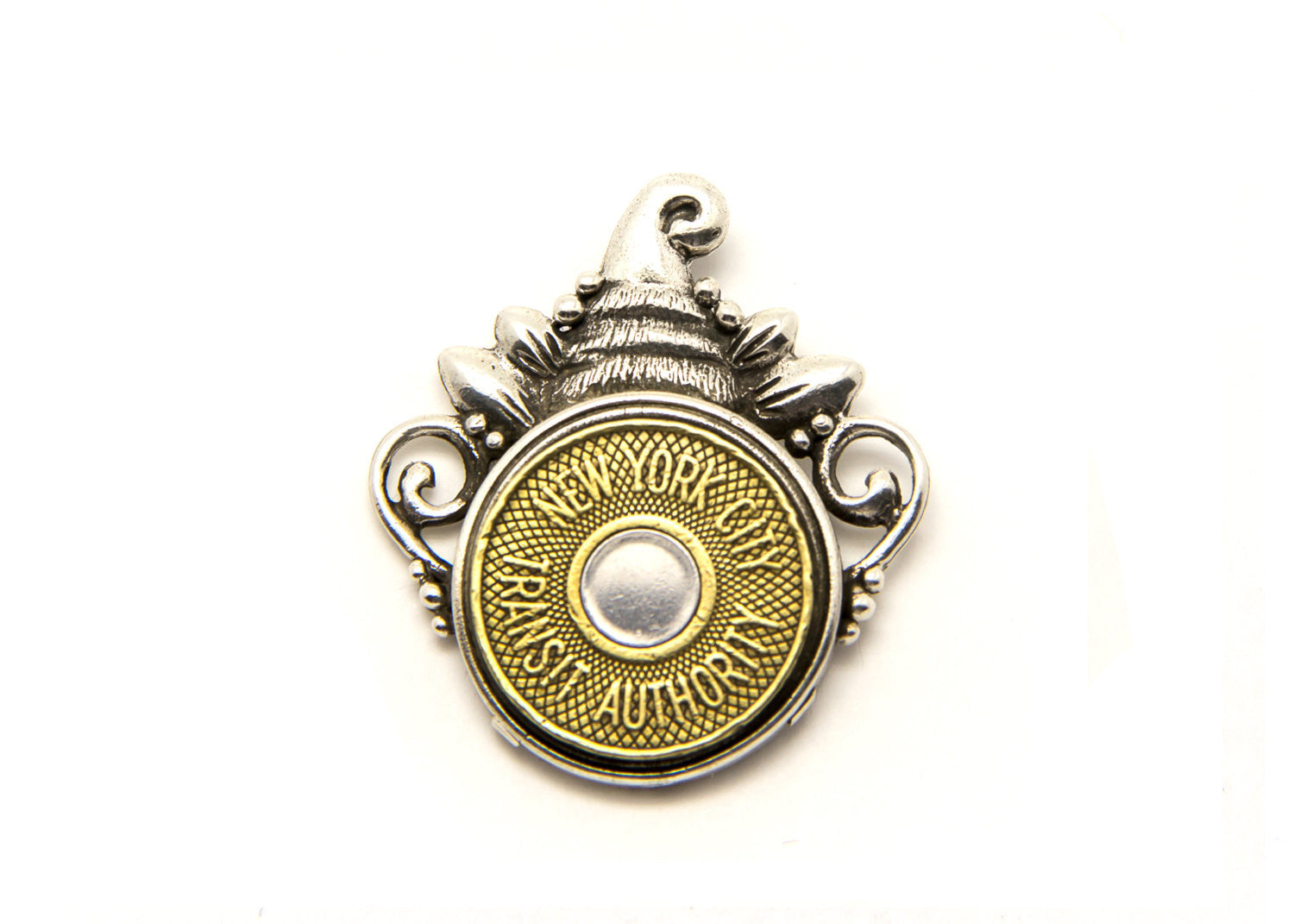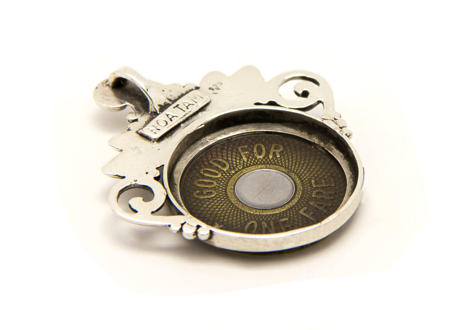 This New York City Transit subway token, in the "Bullseye", has been made into a unique pendant necklace, with sterling silver decorations. It was once used by hundreds of various people to travel through the magnificent NY city expanse. Channel the energy of travel and magnificence with this necklace.