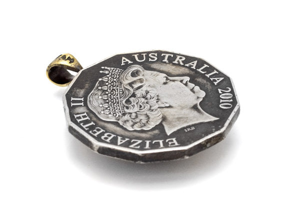 Coin pendant - ooak coin piece with 1 Discovery Dollar coin of the U.S. and 50 Cent coin of Australian