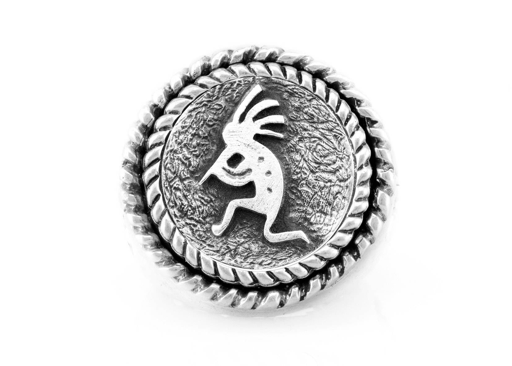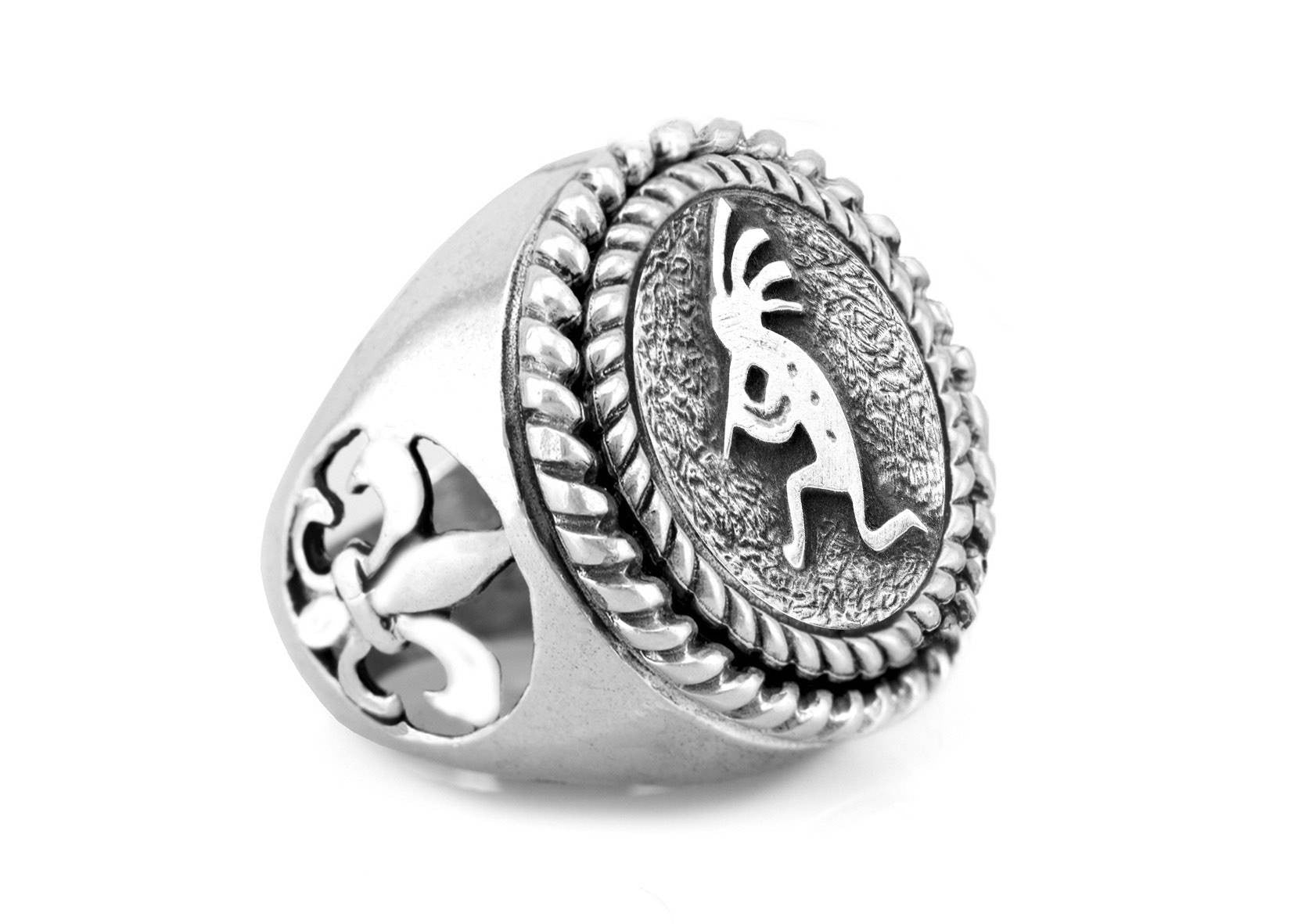 Kokopelli Medallion Ring, symbol of a Native American Fertility god ring, with fleur de lis symbol