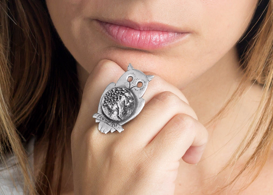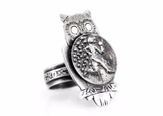 Coin ring with the Running Man coin medallion on owl Noa Tam coin jewelry sport jewelry