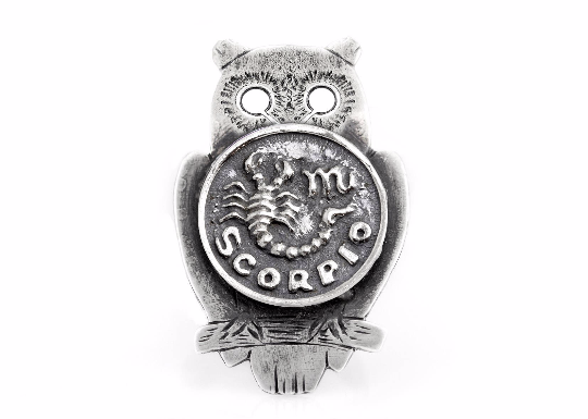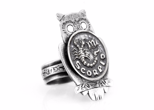 An amazing coin ring with the Scorpio coin medallion on owl