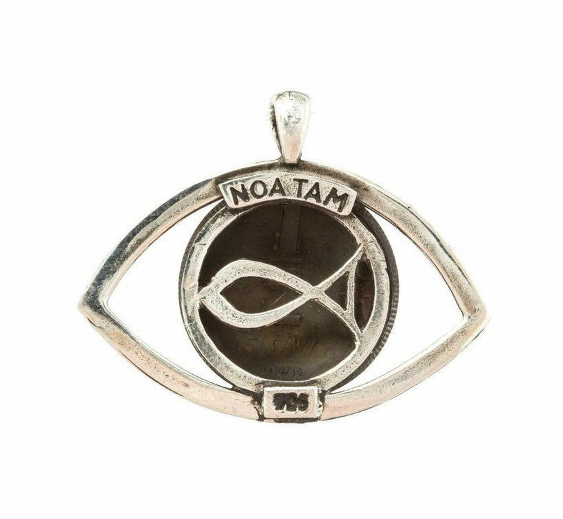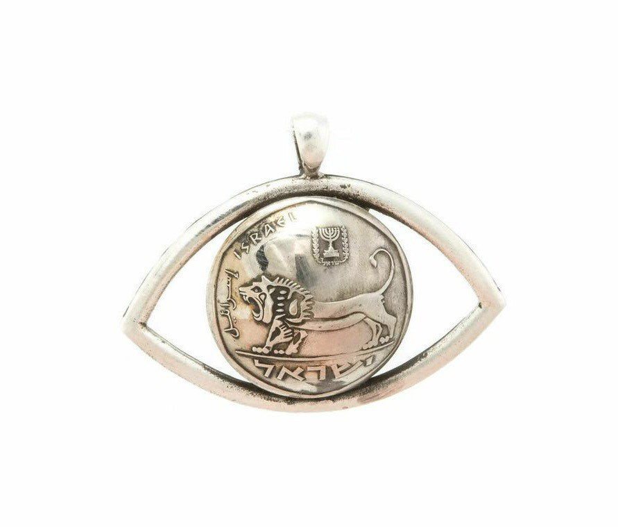 This unique, handmade necklace features the Lion of Courage on the old, collector's 1/2 sheqel coin of Israel in a sterling silver eye-shaped setting.