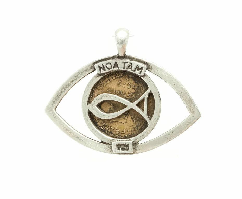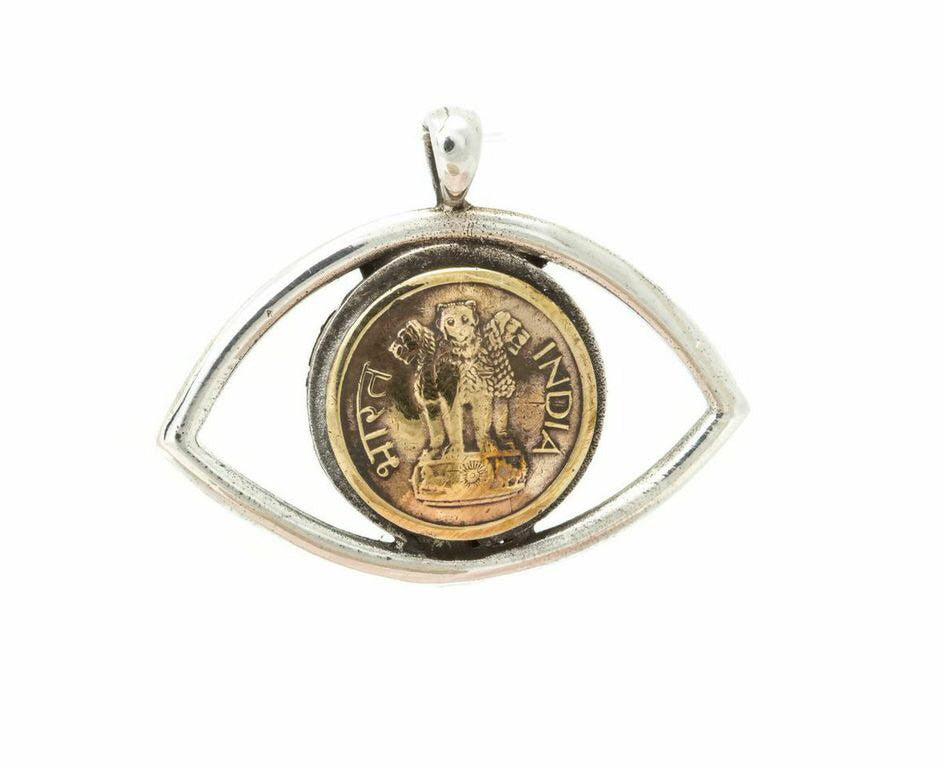 This amazing necklace features an old, collector's 1 paisa lion coin in a sterling silver, eye-shaped frame.