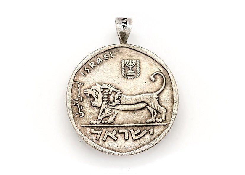 This amazing handmade pendant features two old, collector's coins of Israel, the5 Pound coin and 1 pound coin.