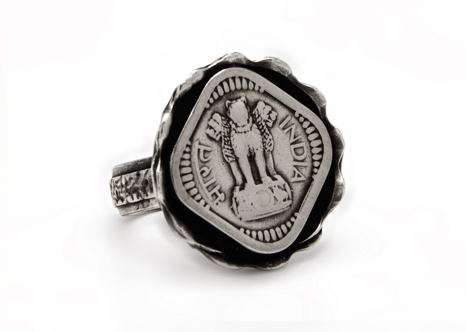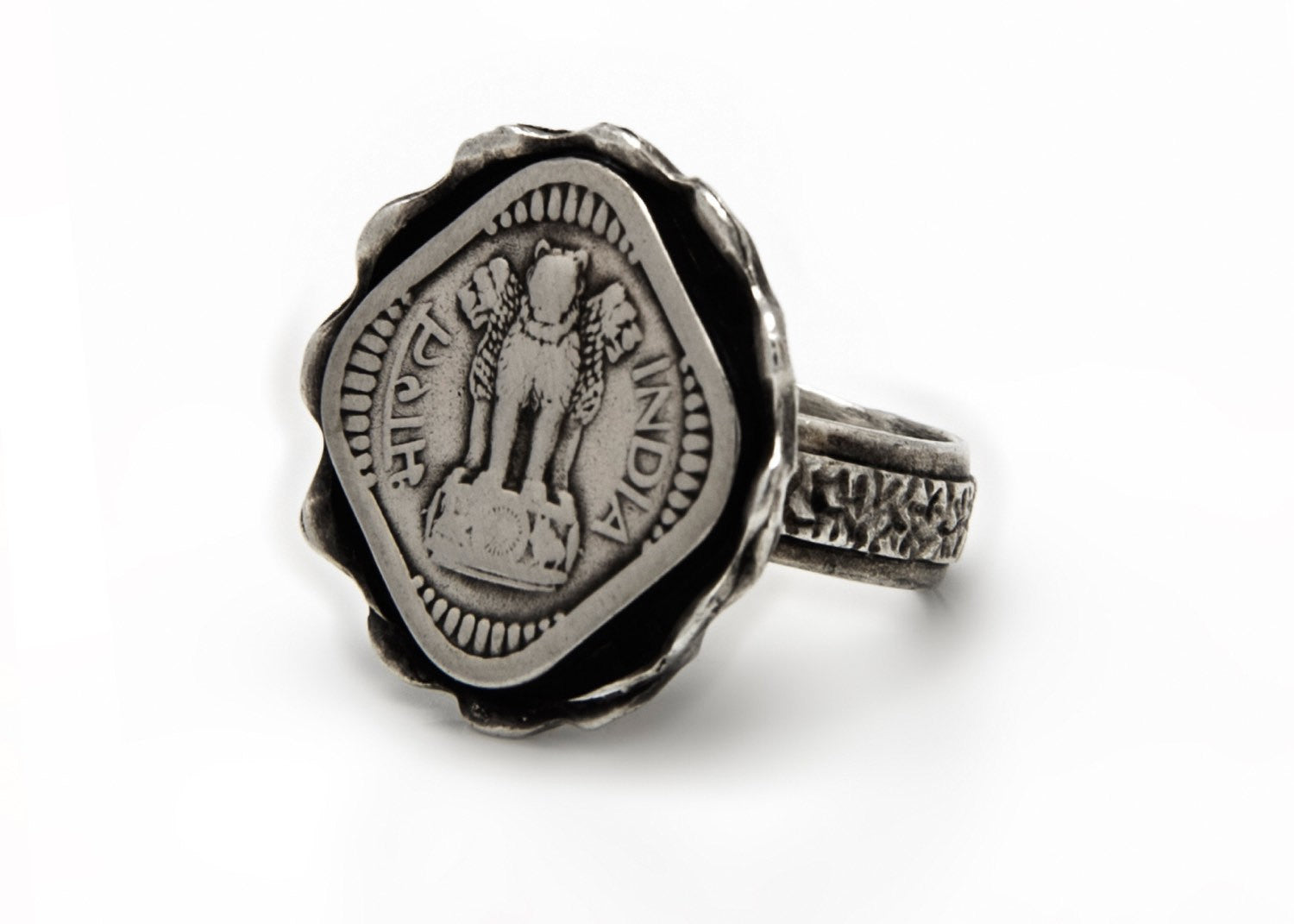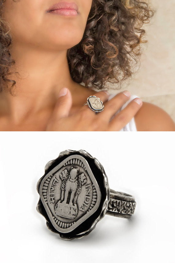 Channel the power of a lion with this ring that features an old, collector's Indian 5 paise coin. This ancient coin on India is placed in a beautiful sterling silver ring.