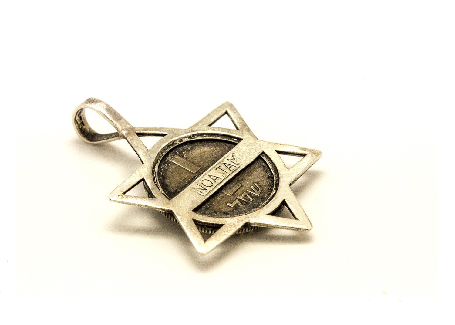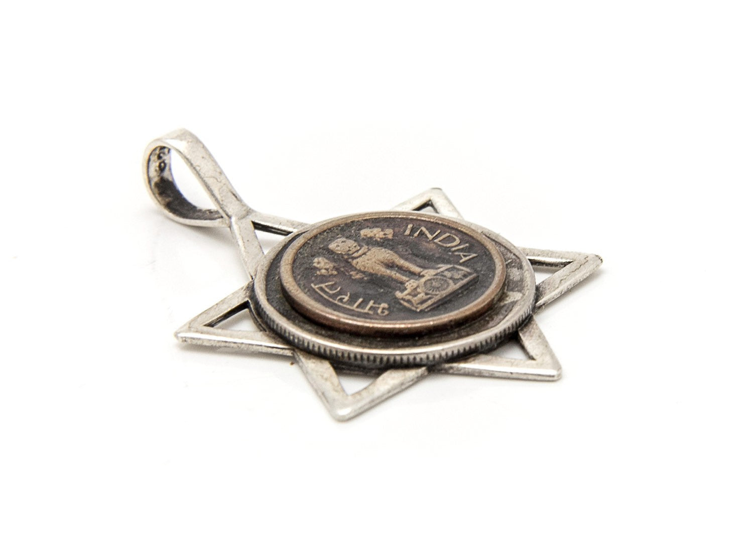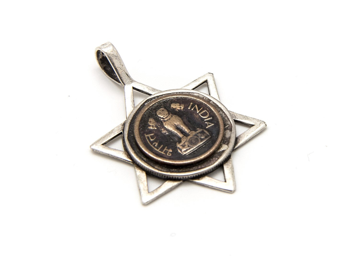 This Star of David ring features to coin: 1 Paisa coin of India and half Sheqel coin of Israel in a handmade, sterling silver necklace that is truly one of a kind.