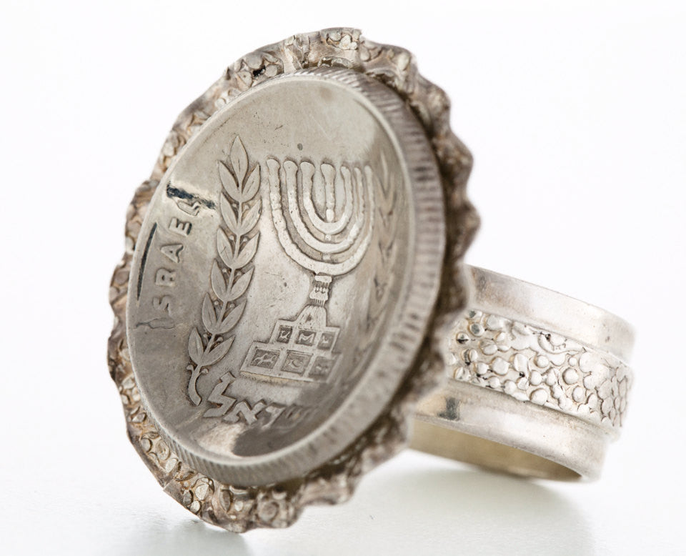 Israeli 1/2 Lira Old Coin Ring - Sterling Silver Menorah Ring