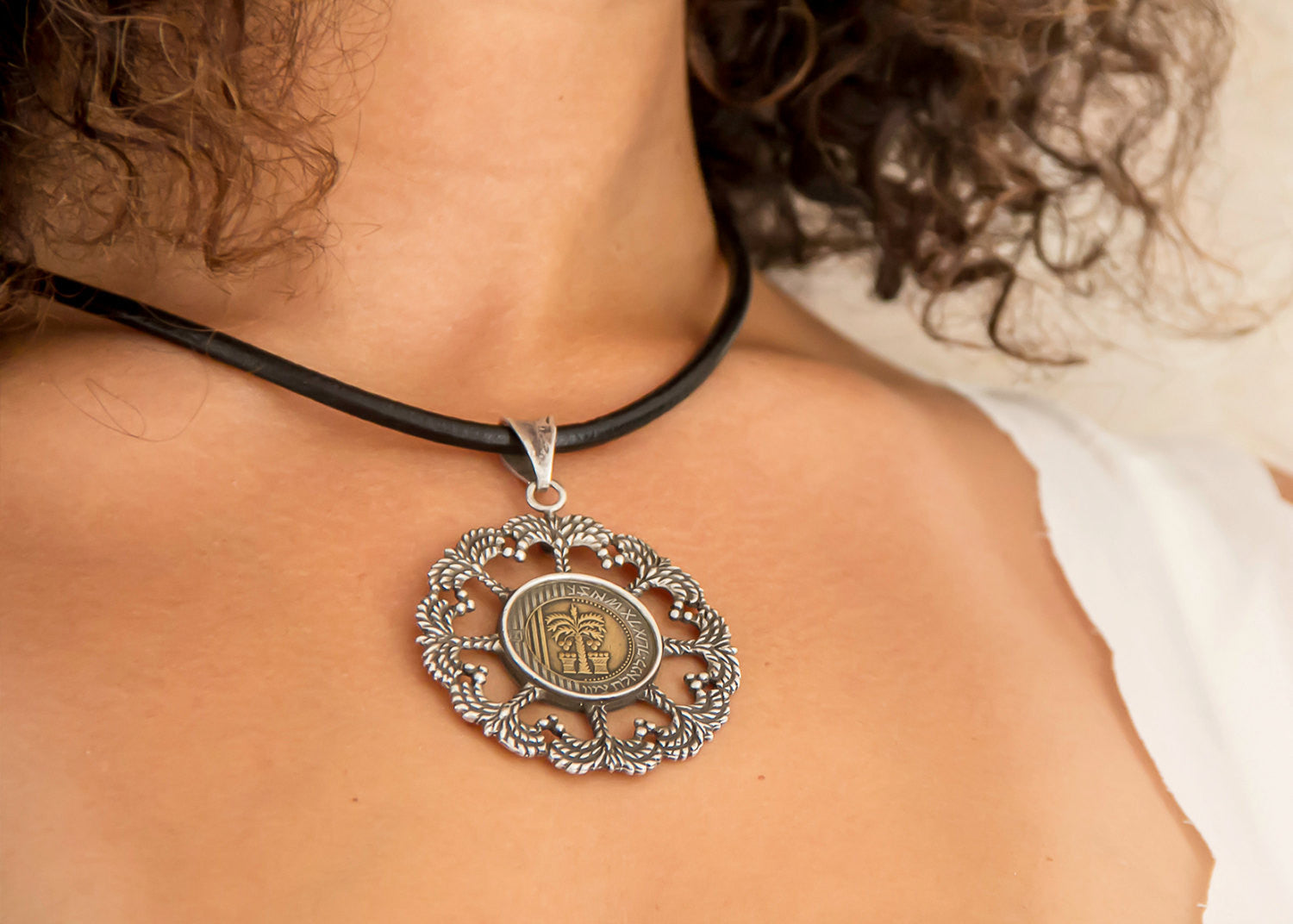 An amazing pendent necklace with the Israeli 10 New Shekel coin of Israel in an intricate sterling silver frame.