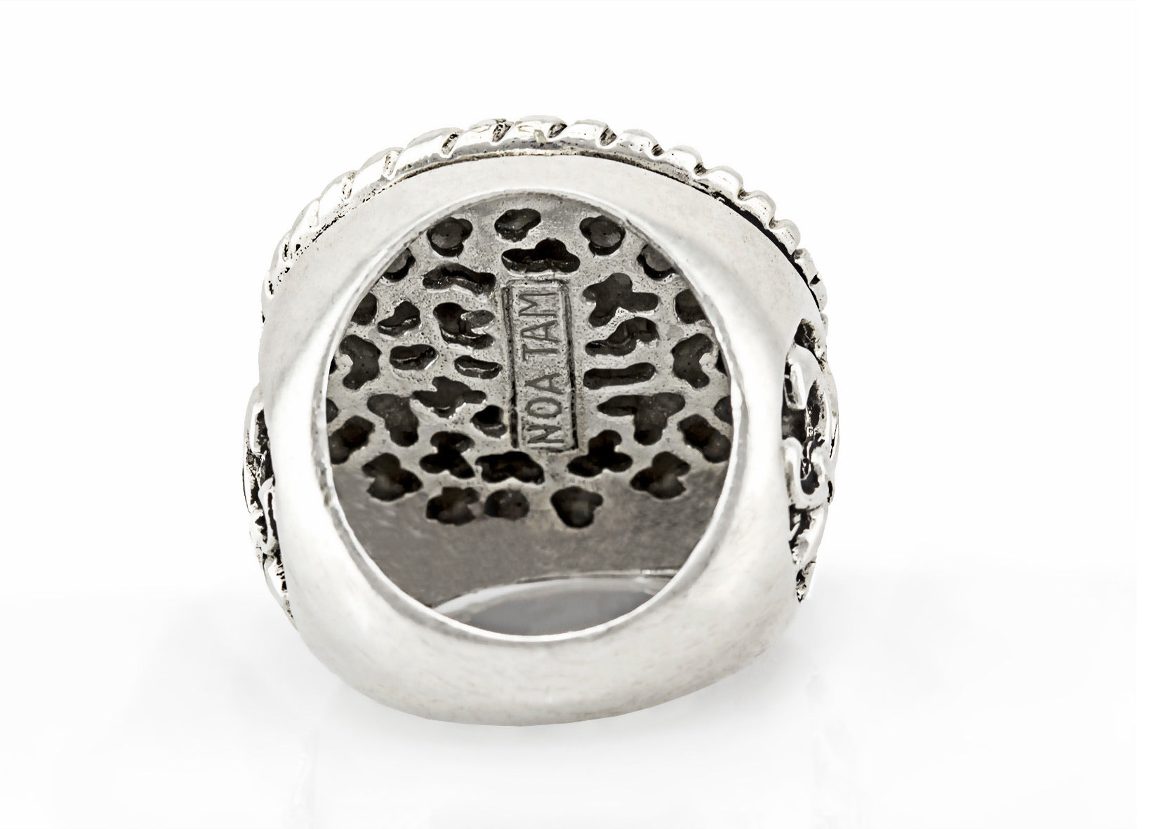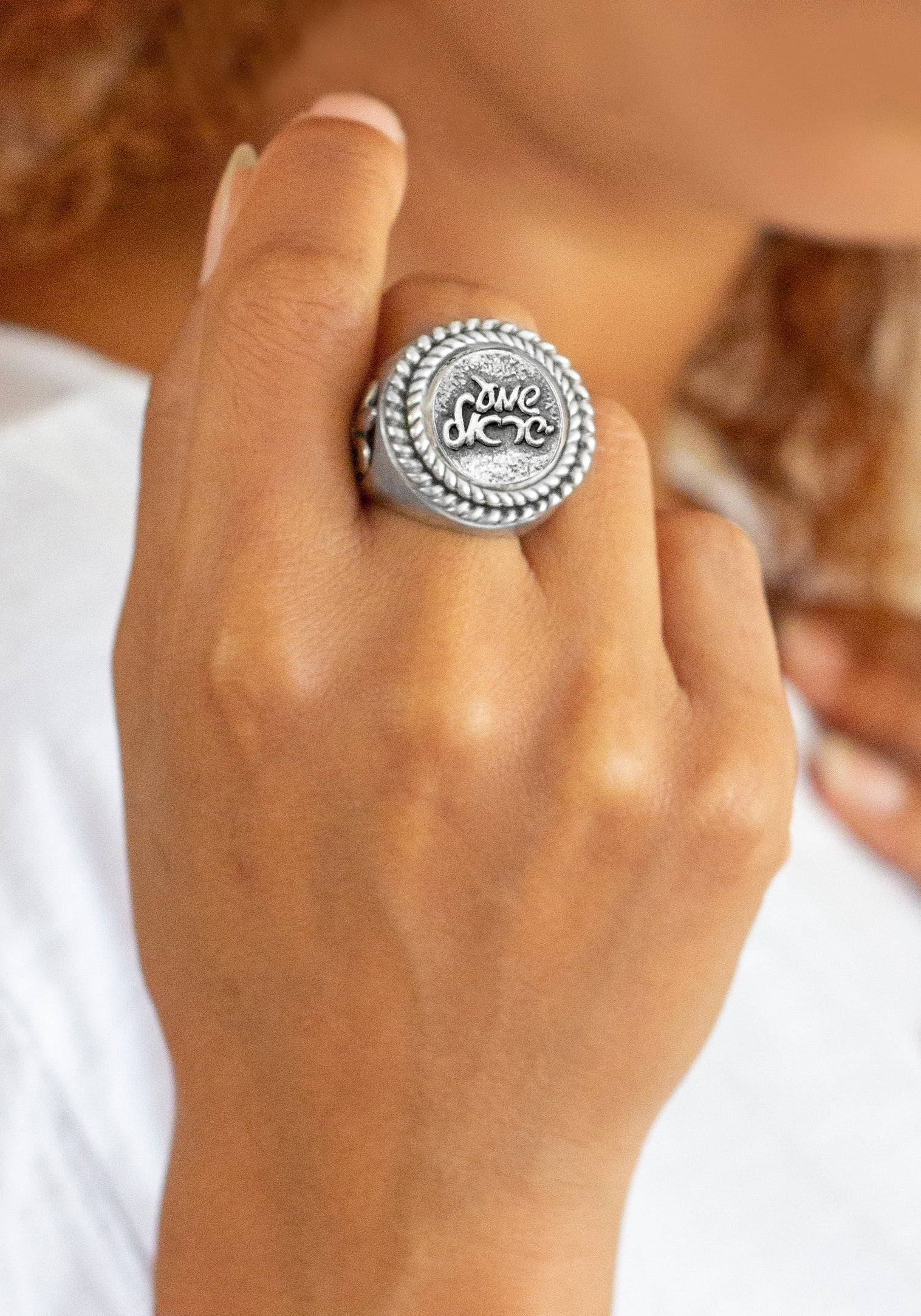 coin ring with the Shema Yisrael medallion on fleur de lis ring