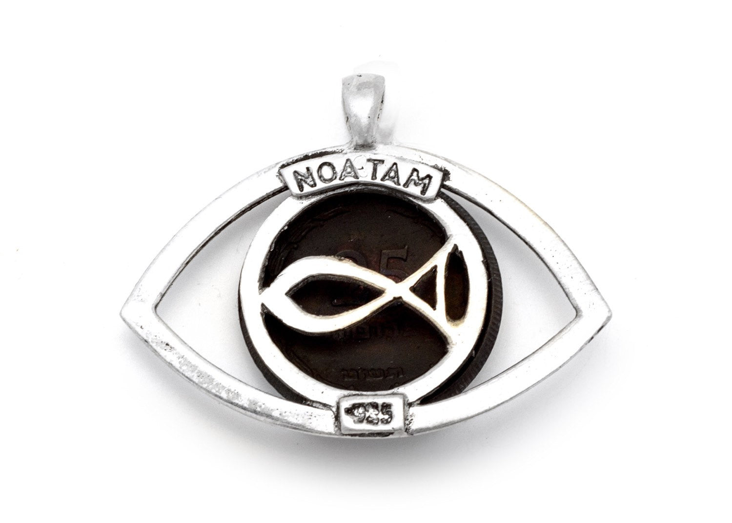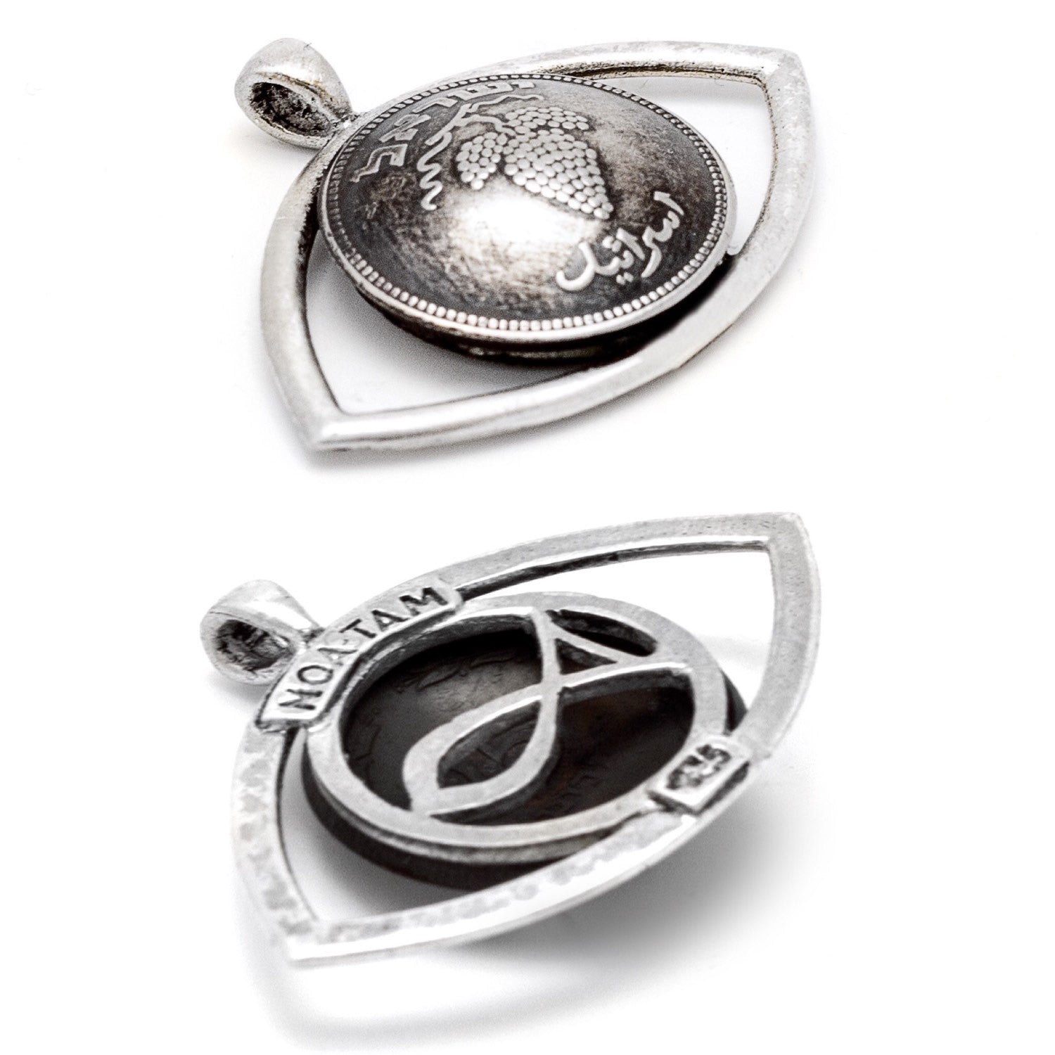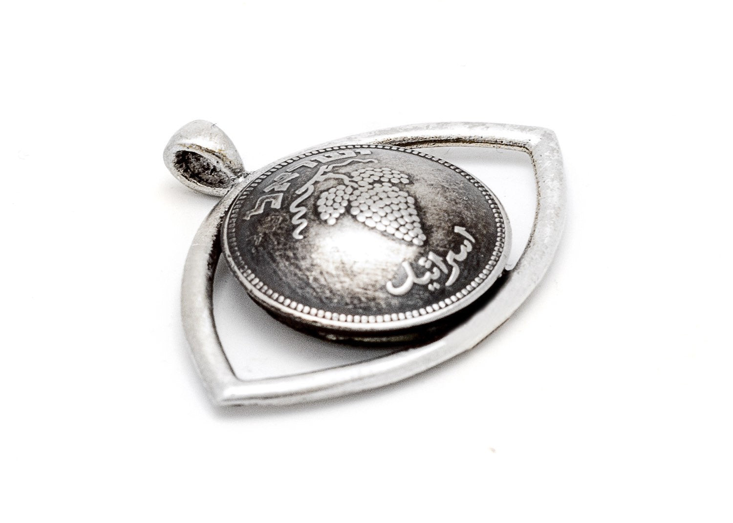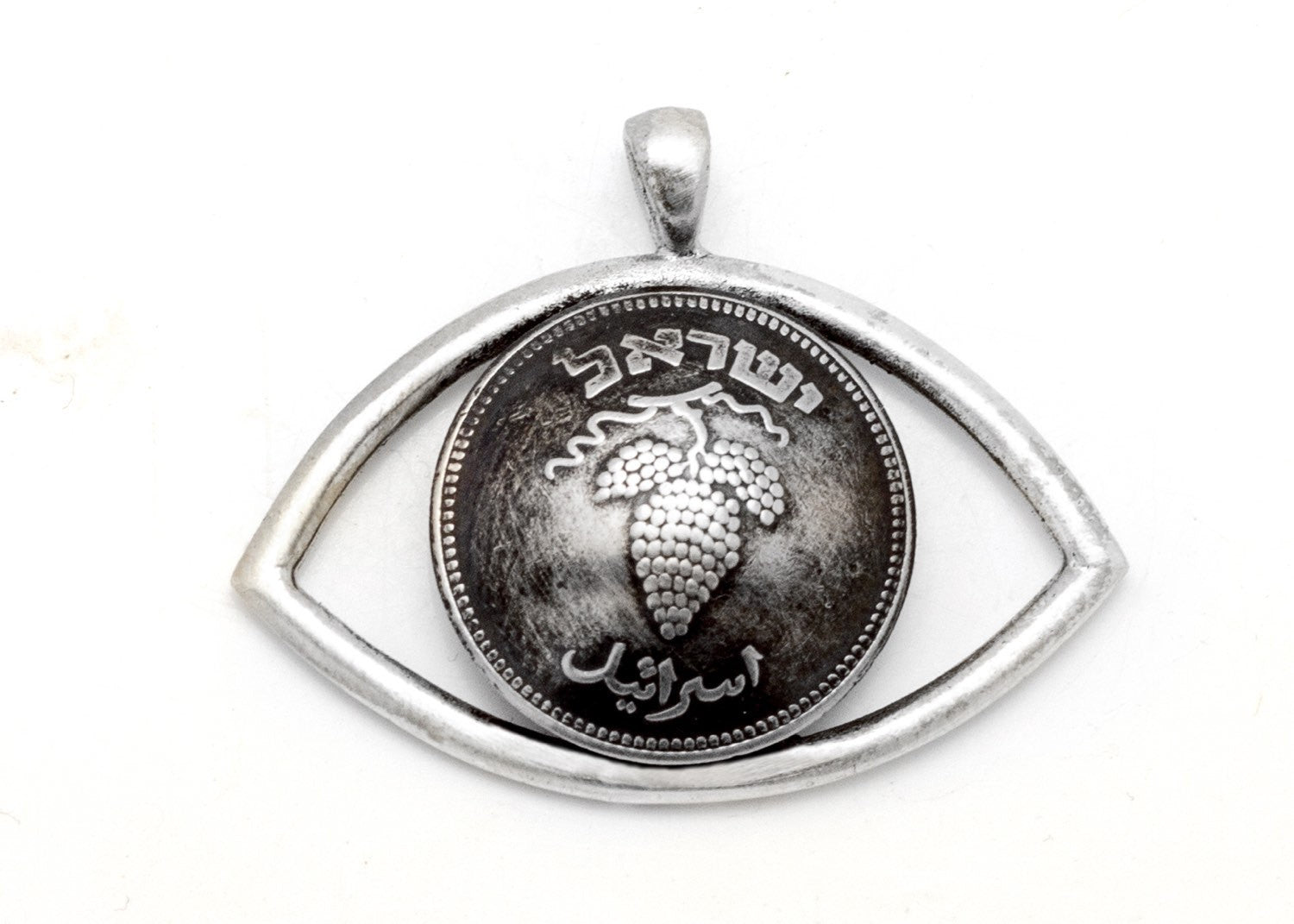 This 25 Pruta old coin of Israel is placed in a beautiful sterling silver frame - making an eye that symbols good luck and protection.