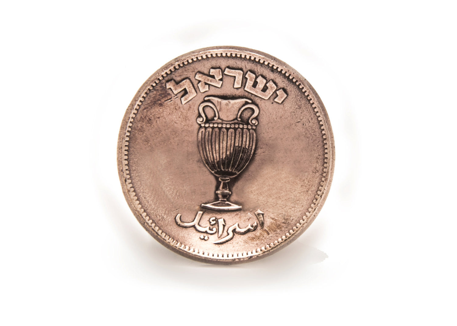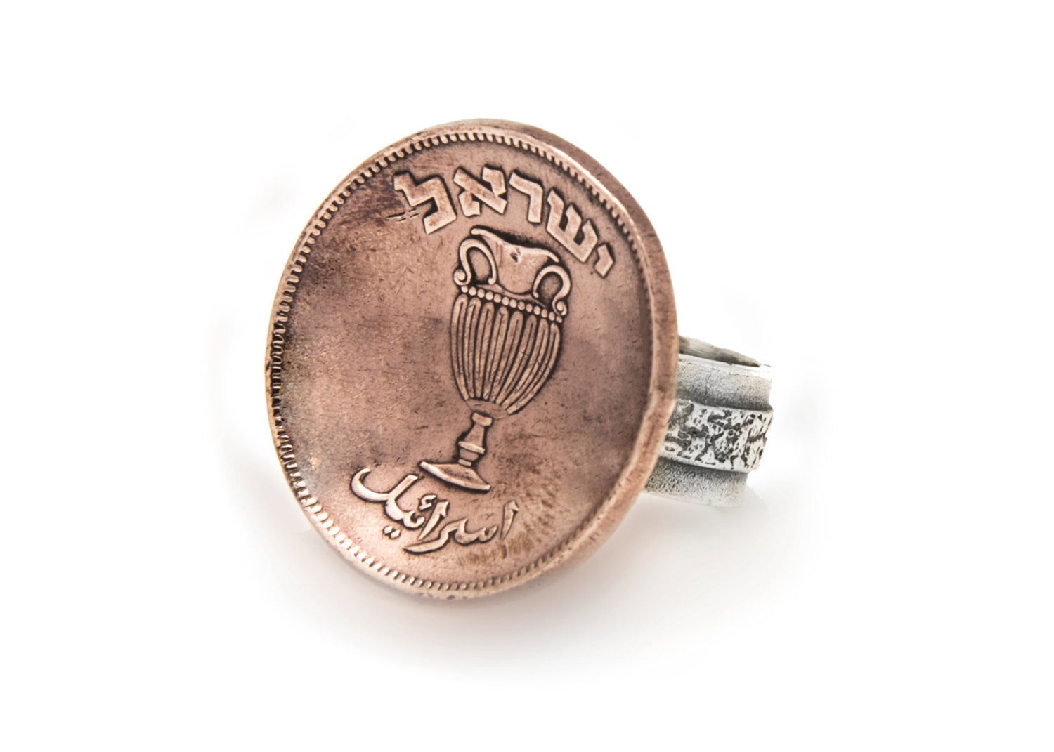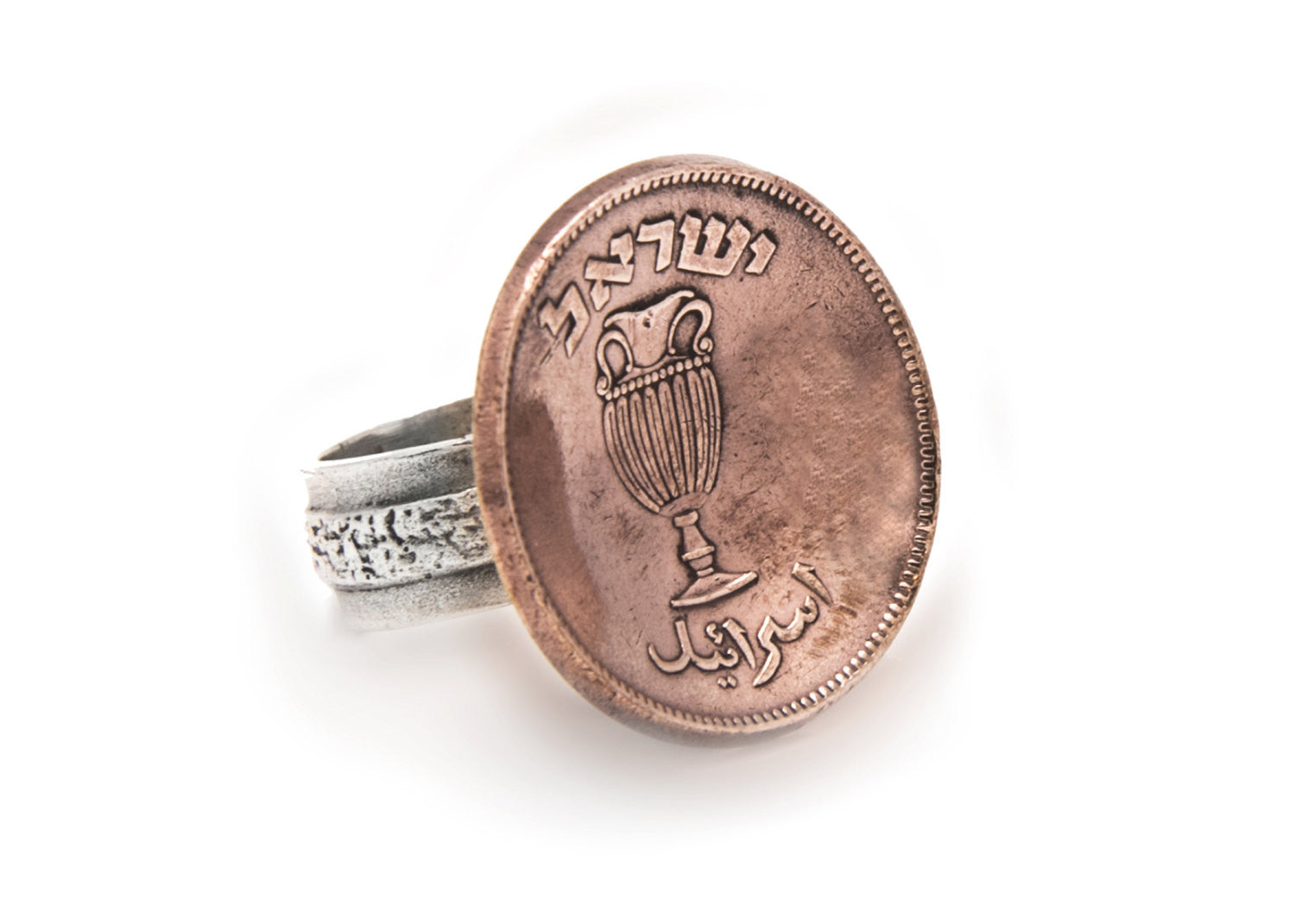 This amazing coin ringfeautres the old, collector's 10 Pruta coin of Israel
