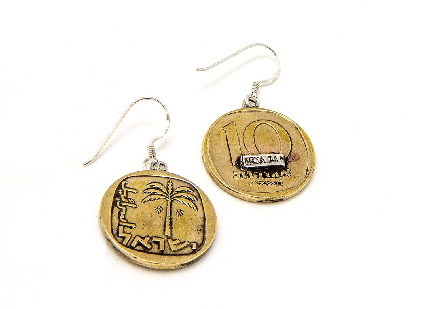 These amazing old, collector's coin dangling earrings feature the 10 Agorot coin of Israel in a sterling silver setting.
