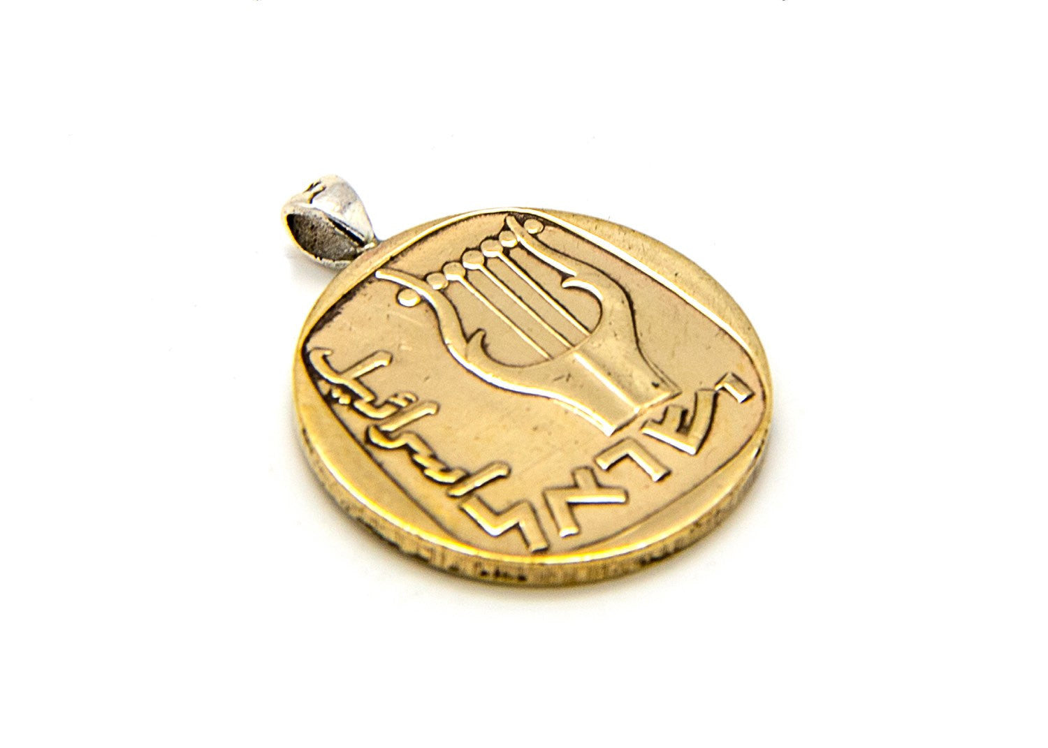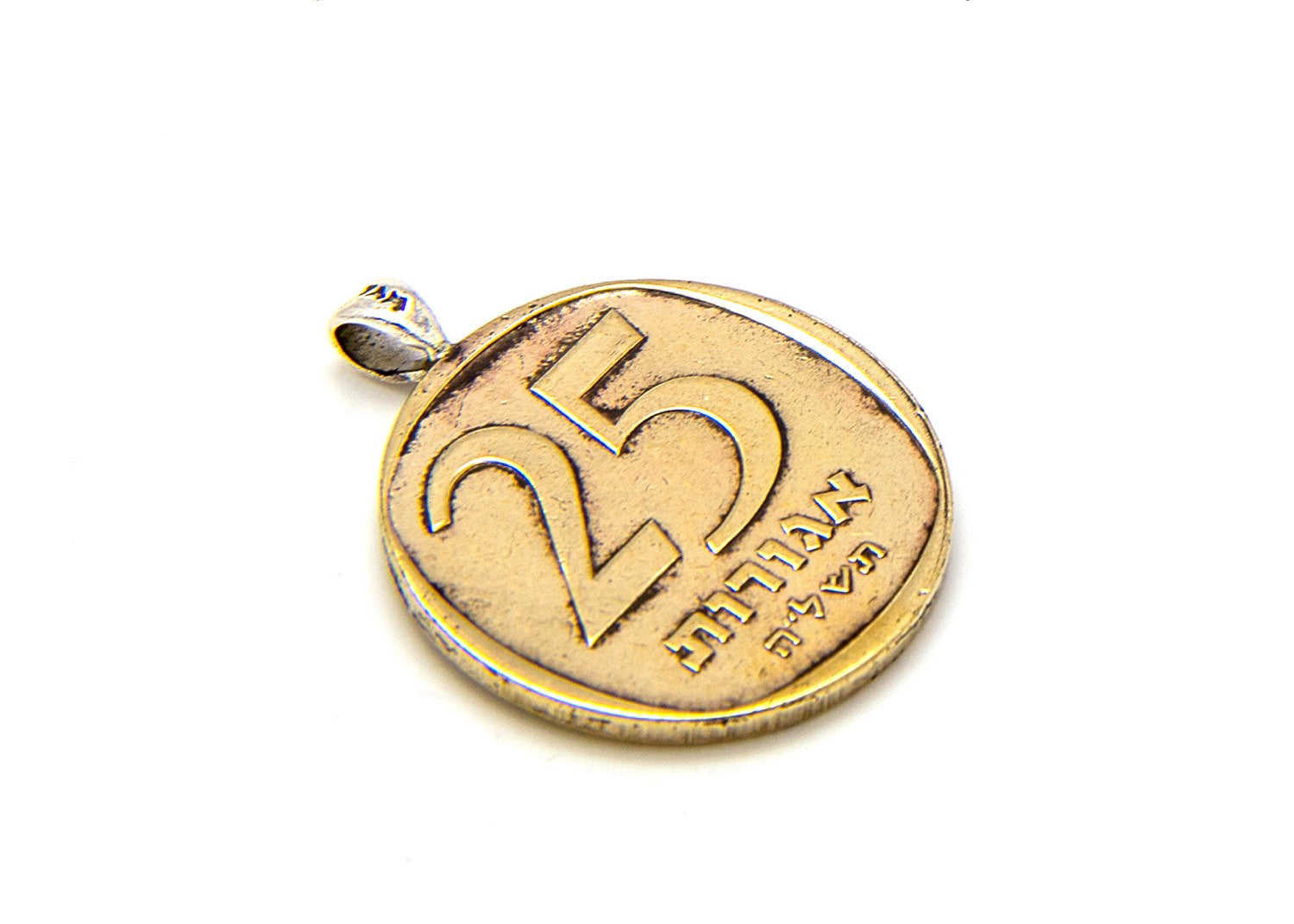 This amazing old coin pendent features the 25 Agorot coin of Israel