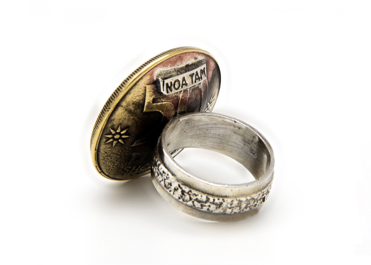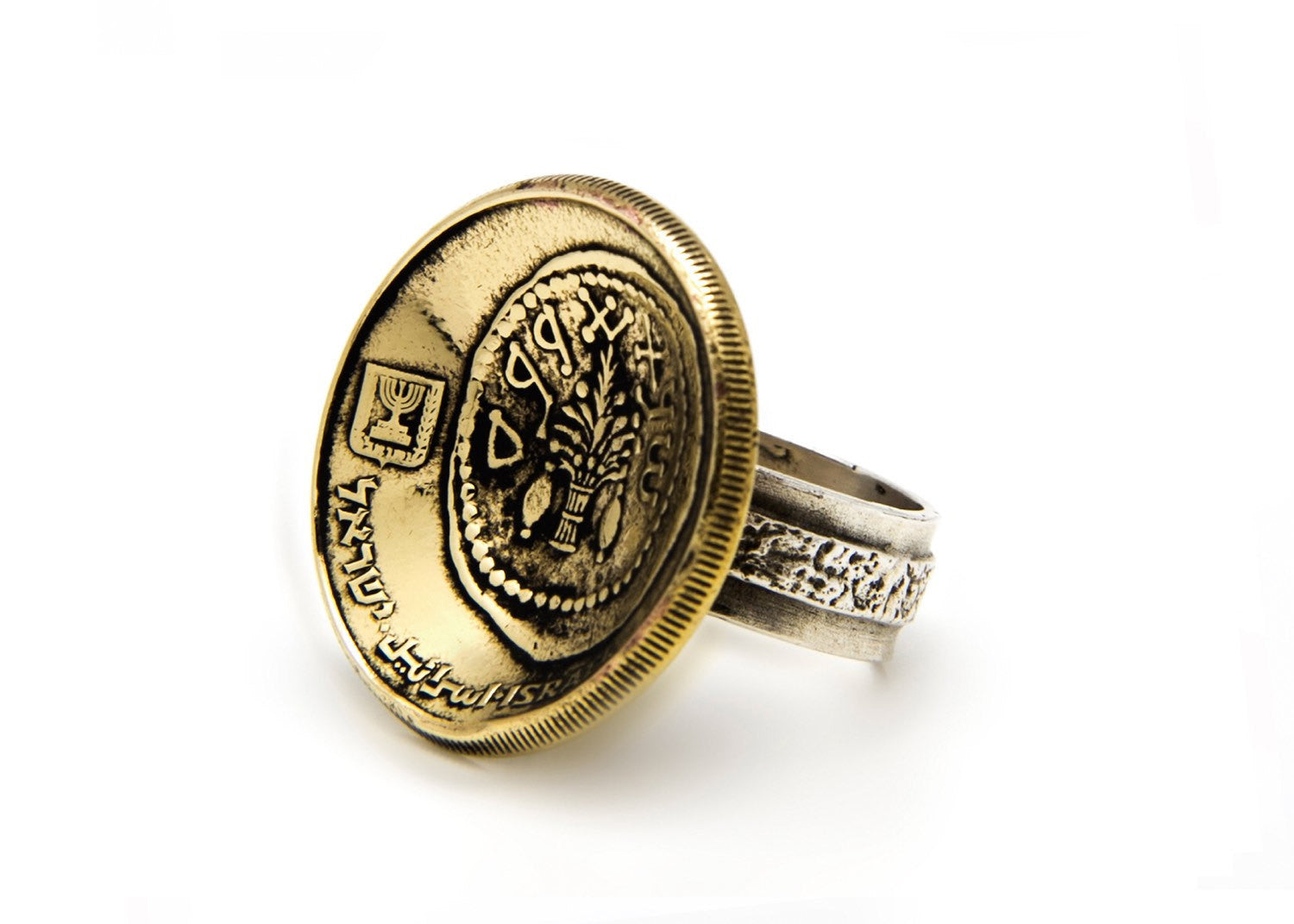 This unique coin ring features the 50 Sheqalim coin of Israel