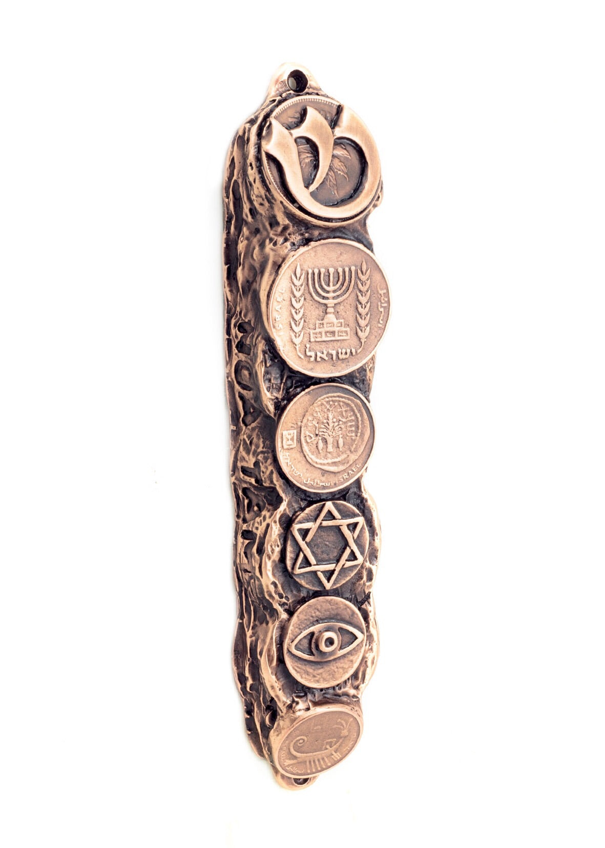 Mezuzah with Judaica Symbols & Blessings in Copper - Small (13cm)