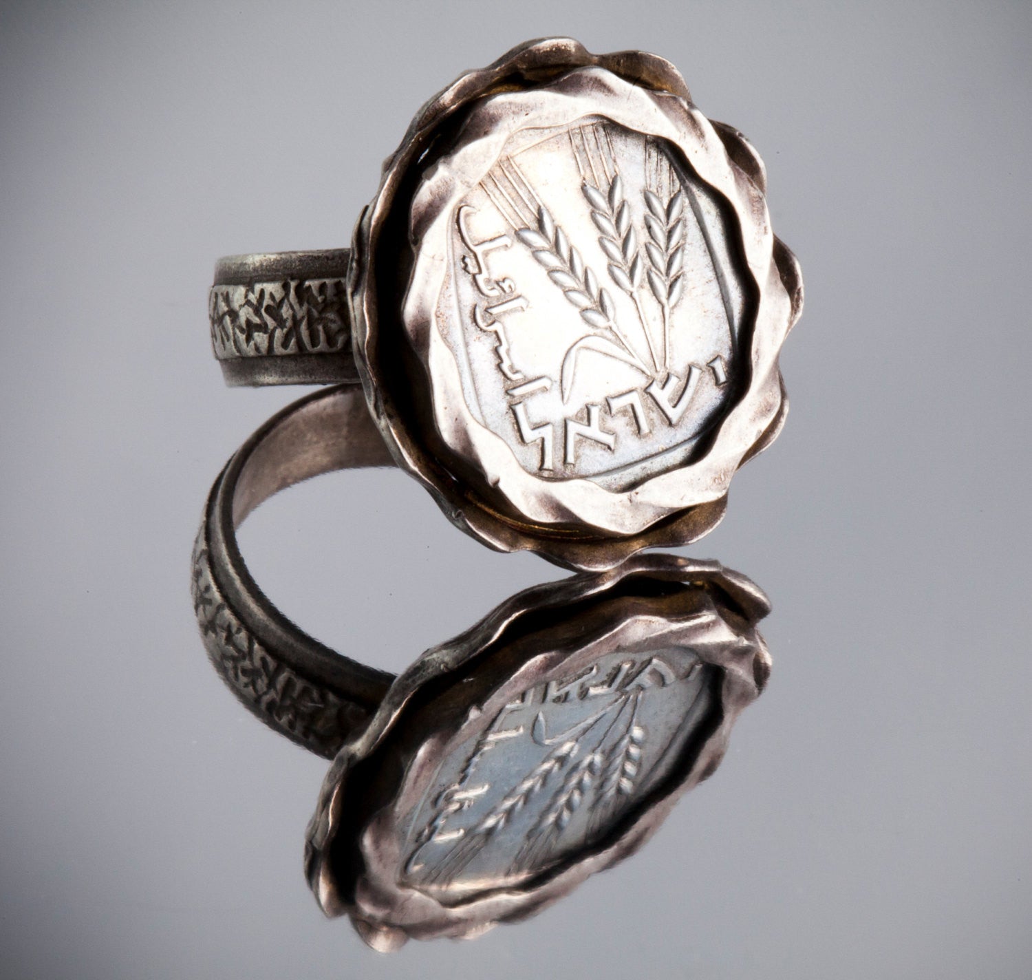 This amazing coin ring features the old, collector's 1 Agora coin of Israel in a handmade, sterling silver setting.